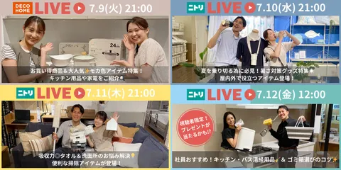 皆さんこんにちは🌞ニトリLIVEチームのきゃとです🐈 来週のニトリLIVEは、こちらのラインナップで配信予定です⭐️ 時間になりましたら↓から視聴いただけます!7/9(火):お買い得商品&大人気✨モカ色アイテム特集!キッチン用品や家電をご紹介🍳 7/10(水