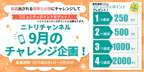 9月チャレンジ企画開催📱✨ 9月は、ニトリチャンネルでみんなが楽しめるチャレンジ企画📱✨を開催します!今日はその概要をちょっとだけご紹介👀✨みんなで簡単なお題にチャレンジして、わいわい楽しむ1か月にしませんか?初参加の方も、常連さんも、気軽に参加できる内容です♪【期間】9月1日(月)~9月30日(火)途中からの参加も可能です😎