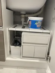 洗面台下収納伸縮フリーラック 洗面台下収納にはこれ!ˎˊ˗伸縮フリーラック 伸縮するのでサイズも合わせやすく、収納力がアップしました✨高さも変えられます🌿洗面台下の収納はこれしか考えられないほど、賃貸時代から戸建ての今もずっと愛用しています🌸