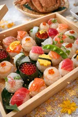 大晦日は酢飯を握って手毬寿司を作りました🍣 1口サイズに握った酢飯に好きな具を乗せるだけ‼️ついでに逆おいなりさんも作ってみました。 いつもの酢飯を小さく握るだけの簡単お寿司です🍣とても食べやすいのでオススメです!!