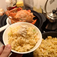 カニチャーハン🦀 漁師のお手伝いをしてたくさんカニをいただいたのでカニチャーハンを作ってみました🦀小さめのワタリガニなので6杯ほど使いました。茹でて冷まして剥いて・・・とても時間がかかりますが結構おいしかったです✨カニは低カロリー高たんぱくなのでダイエットにもピッタリ👍アレルギーのない方にはおすすめです🦀しかし、知ら
