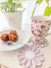 本日のおやつ&お花コースター 本日はお休み〜💕と言うことで…簡単なおやつ「サーターアンダギー」を作りました😋簡単だけど「レシピ投稿」へアップ致しましたので気になる方はそちらをご覧いただけると嬉しいです☺️さて 暖かくなり冷たい飲み物が欲しくなってきました!気になるのはコースターです。先日ニトリで目にした可愛いコースター🌼デコホー