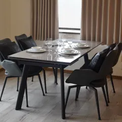 ニトリEXPRESS湘南モールフィル店 🪄さん 【テーブル】 ・天板:光沢のあるマーブル調の天板が高級感を演出。 ・脚部:ブラックのメタルフレームで、直線的なデザインのモダンスタイル。 【チェア】 ・デザイン:座面と背もたれにボリュームがあり、アームレスト付きで快適さも確保。 ・脚部:細身のブラッ