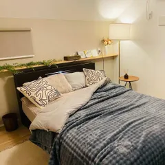 落ち着いた暗めの照明とファー素材が、ホテルのような雰囲気をつくるベッドルームコーディネートに。ブラックとグレーを基調に、ブルーとゴールドのリースやアートをアクセントに加えて華やかさを演出し、ヴィンテージラグが奥行きと重厚感をプラス。静かで贅沢な時間が流れる洗練された寝室を目指しました! ニ