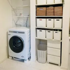 コンパクトなドラム式洗濯機でスタイリッシュな洗面脱衣所を実現! 便利な機能だけでなく、シンプルな見た目がインテリアとしても調和します。 可動棚には、ランドリーボックス、3段チェスト、ボックスを使って隠す収納を実現しました! ニトリネットでチェック