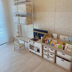 渋谷公園通り店 ぽちまるさん 子供部屋です。おもちゃがたくさんありますが、なるべく収納し、いつもすっきりした状態にしています。たくさんあるおもちゃもポルダを使うことで上の方も収納を活かして、たくさんしまえるようにしています。ホワイト、ベージュでまとめています。 ニトリネットでチェック
