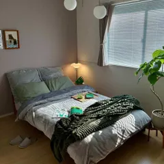 ベッドは主にニトリアイテムで、柔らかく落ち着き・癒し効果のあるグリーン×グレーでコーディネート。カーテン代わりのマルチクロスとブラインドにすることで、朝や昼の自然光が柔らかく入ってくるためリラックス度が高いです。ブラインドから入る光がベッドに影を落とし、ホテルスタイルな雰囲気を作ります。