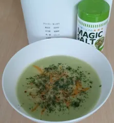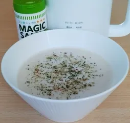 簡単!豆乳スープ スリム調理ポットで豆乳を作りスープにしました🥣・・・と言っても、できたて豆乳に「S&Bマジックソルト」をさっさっと振りかけたら出来上がりの超簡単スープです😅「あっさり」ボタン25分大豆70g(事前に~8時間浸け置きしておく)水500㎖材料を入れて「あっさり」ボタン押す熱々とろっとして美味しい