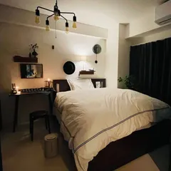 落ち着いた暗めの照明とファー素材が、ホテルのような雰囲気をつくるベッドルームコーディネートに。ブラックとグレーを基調に、ブルーとゴールドのリースやアートをアクセントに加えて華やかさを演出し、ヴィンテージラグが奥行きと重厚感をプラス。静かで贅沢な時間が流れる洗練された寝室を目指しました! ニ
