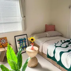 府中店 naheeさん 木のぬくもりと、見ているだけでハッピーになれるカラーをバランスよく取り入れた、心がパッと明るくなるワンルームを目指しました!🌻🫧 狭い一人暮らしの空間でも、自分の「好き」をぎゅっと詰め込むことで、毎日を明るい気持ちで過ごせています。ベッドの隣には、趣味で作ったお気に入りのアートを2つ並べてみました。