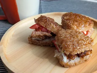 冷凍シェフレンジ〜焼きおにぎりサンド〜 〈材料〉冷凍焼きおにぎり 6個トマト 1/4個キャベツ 1/2枚市販のハンバーグ 1個マヨネーズ 適量〈作り方〉①キャベツは千切り、トマトとハンバーグはそれぞれおにぎりのサイズに合わせてカット。②冷凍食品あたためで焼きおにぎりを温める。③焼きおにぎりを半分にカット、具材を挟ん