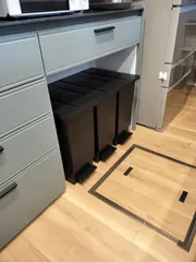 使いやすいキッチンの両開きゴミ箱🗑️ 私の推しアイテムは、棚下でも使えるペダルペールです!32Lと45Lが売られてましたが、我が家は45L*3つがキッチンのカップボード下にピッタリでした👏 足元を踏んだ時に両サイドがパカリと開くので高さが出ず、カップボードの裏部分に当たらないです。開閉も結構スムーズ!3ヶ月ほど使ってますが壊れ