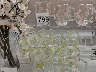 ニトリに春が来た🌸🏵️ 透明な中に🌸(桜)と🏵️(ミモザ)のお花が沢山咲いているカップ眺めているだけでウキウキしてしまいます♪桜の造花の飾りもあって春らしい演出もステキでした