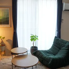 本部 NOAさん シンプル&モダンなダイニングセットは、 セラミックのテーブルやファブリックのチェアが丸みのあるデザイン。 それに合わせて照明も大きめで丸みのあるペンダントライトを選び、空間全体をふんわりと包み込んでくれるようにしています。 観葉植物やディフューザー、クッションなどの小物でナチュ