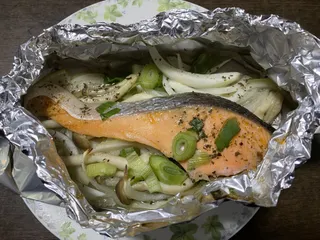 材料鮭の切り身(甘鮭、生鮭なんでも🉑)玉ねぎネギしめじバター(魚ひとつに10グラム目安)料理酒塩コショウ乾燥バジル(パセリも⭕️)ここにもエスビーさん、意外とうちにあるwアルミホイルを大きめに切って玉ねぎ、しめじを下に。魚はその上に乗せてネギを乗せたらサイドをぎゅっとして半分包むようにする。料理酒